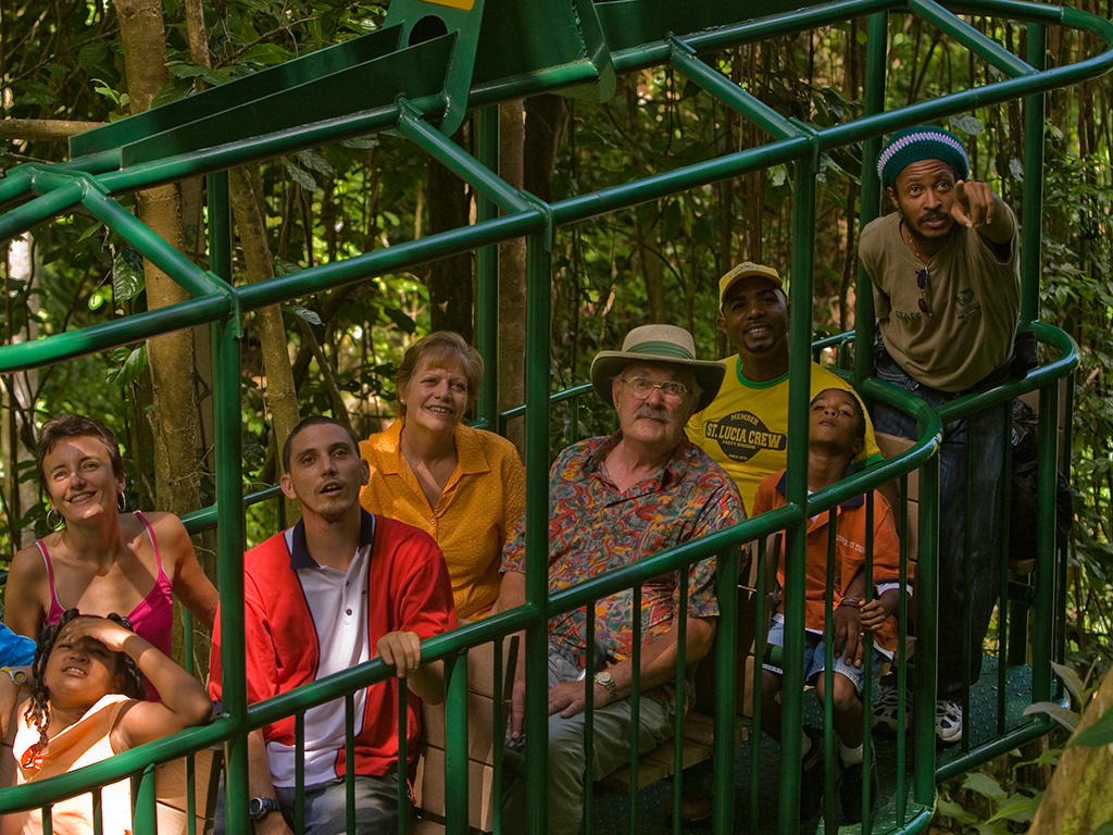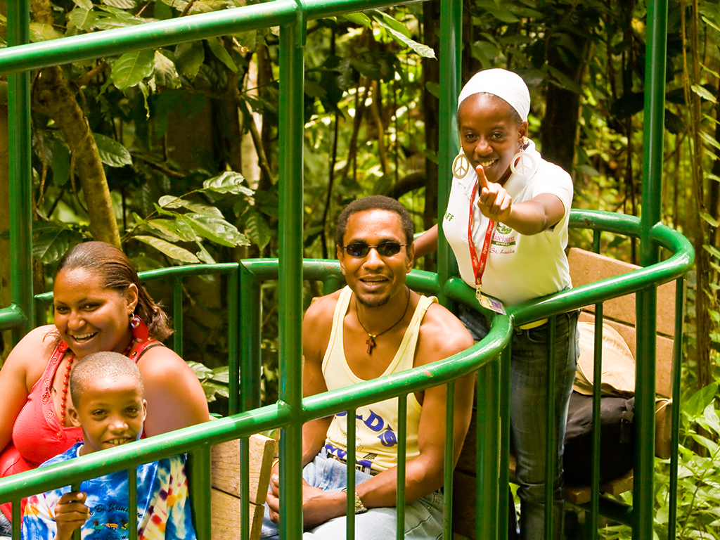 The Aerial Tram Tour transports guests up and away from the heat and bustle of the lowlands to an ecological park located in the heights of St Lucia’s forest reserve. Sixteen open-air gondolas ascend noiselessly through the rainforest, offering guests a magical view of nature in its majesty – towering gommiers, impressive chatanniers, and the remarkable phenomenon of the strangler ficus, alighted upon by playful humming- birds and banana quits. An experienced Nature Interpreter will point out giant ferns and magnificent heliconia, and identify the calls and the plumage of the birdlife that makes the Caribbean Oceanic forest its home. The descent affords a bird’s eye view of the forest and a spectacular panoramic vista of the north of the island.