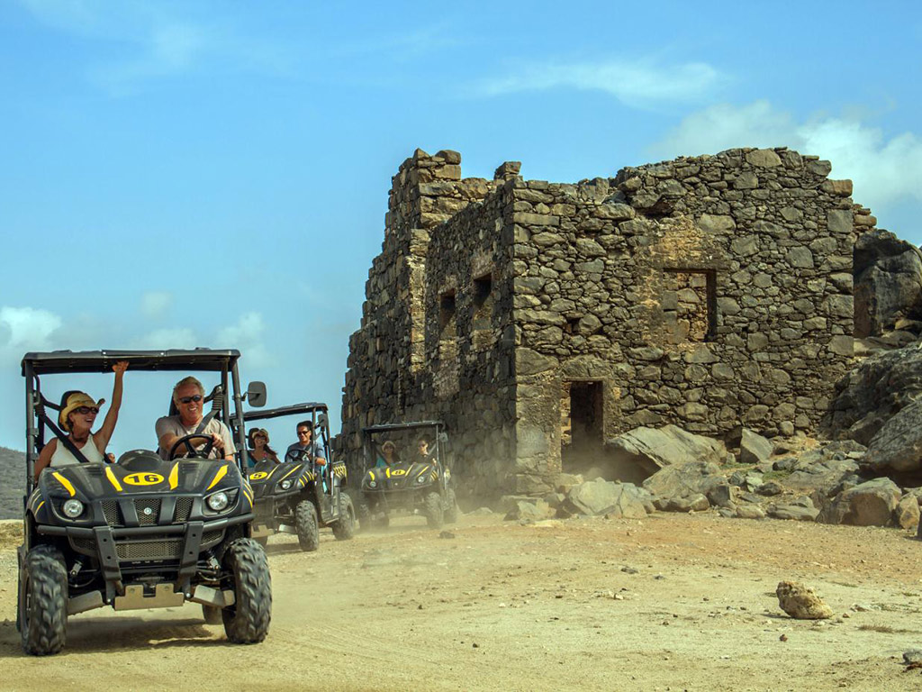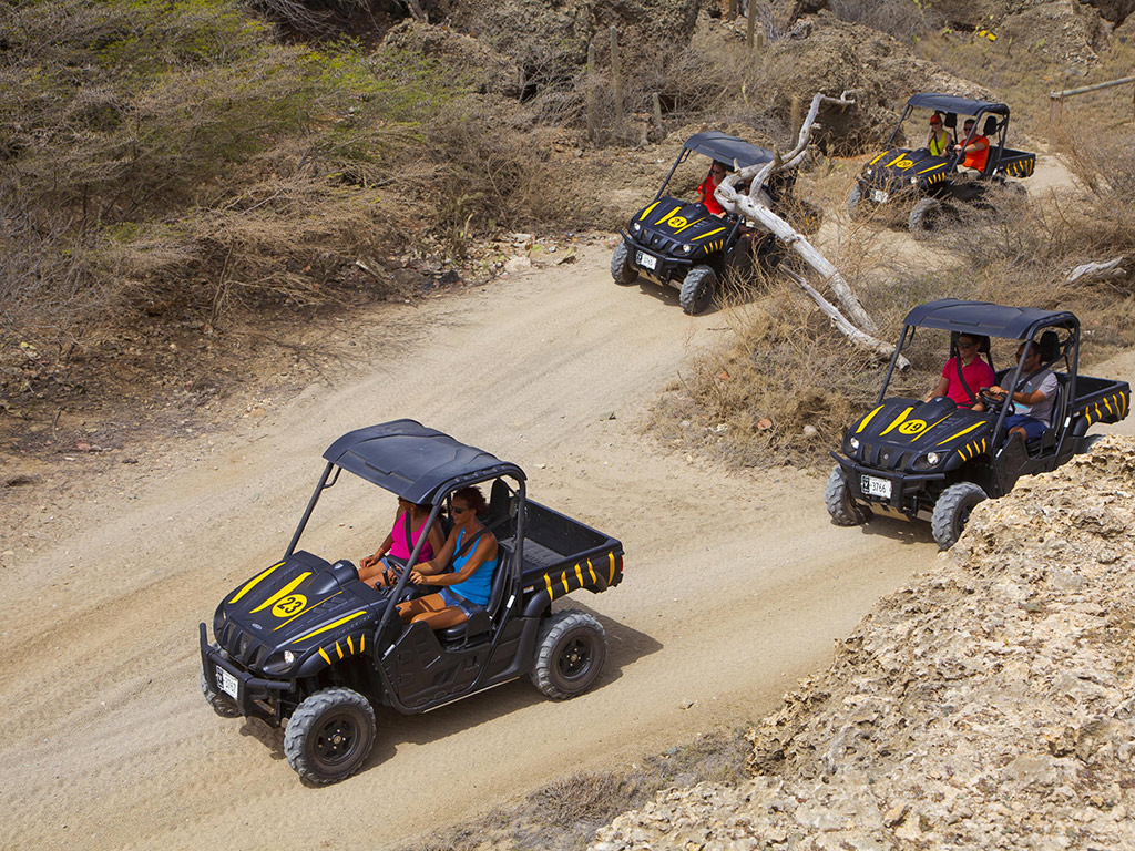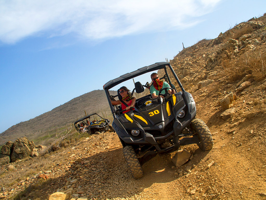 Super-charge your vacation and jump behind the wheel of our unique UTV vehicles in a professionally guided off-road safari along the Andicuri Trail. Prepare to get down and dirty blazing this trail as only our UTV's can. Each UTV carries a maximum of two passengers in a caravan formation that will take you through the wild beauty of Aruba's outback, skirting along the rugged coastline with visits to Andicuri, the Alto Vista Chapel, the Gold Mill ruins and our historic California Lighthouse. Redeem informationVoucher type: E-VoucherE-voucher. Show the voucher on your mobile device to enjoy the activity.LocationStart point: Hotel pickupEnd point: Same as the starting pointScheduleOpening datesMorning Tour08:30 - 13:00Afternoon Tour14:15 - 18:45Duration: 4,5 HoursGuide optionsGuide type: GuideRequirementsMinimum Age: 12 years old. Drivers of the UTV must be over the age of 23 and hold a valid driving license. Not suitable for expectant mothers or people who suffer from back problems. Maximum weight: 260lbs (118kgs).RecommendationsWe recommend you to use long pants, firm shoes like sneakers (slippers are not appropriate). Please bring swimming suit, one extra clothes, cash, biodegradable block sun, sunglasses, sandals, hat or cap.