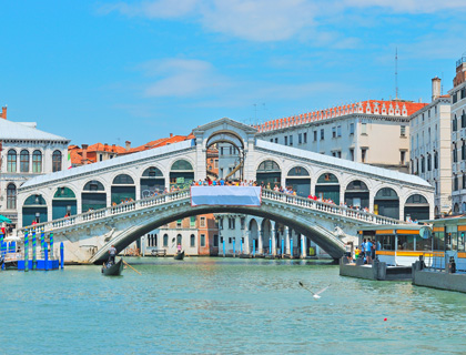 A visit to the Rialto Bridge, an incredible marble structure that cost Venice a small fortune to build but was certainly worth every penny, is a highlight of this journey, and here our walking part ends. Now it is time to take a seat on the water taxi, and enjoy the beauty of the city. Our tour continues with a cruise on the Grand Canal, the city’s main waterway which snakes its way past no less than 50 palaces, six churches, four bridges and two open-air markets. Although many visitors opt to travel the Grand Canal by gondola, this wide and hectic waterway is much better suited to the water taxis we use, which allow us to move quickly and easily along the canal without losing the intimacy of a smaller vessel.