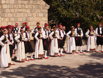 A joyful celebration of life takes place in the church square after the mass. Dressed in dark skirts / trousers with crispy white starched shirts, red belts embroidered in gold silk, bright red leather shoes and matching read caps, locals perform songs and dances form the village and the region.