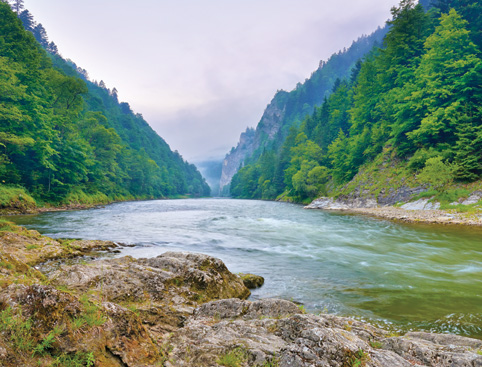 The Dunajec River Gorge runs through the Pieniny Mountains in the south of Poland and the north of Slovakia (as Dunajec is the border river between the two countries in the area). It is one of the best-known tourist attractions in the area. Wooden canoe trips have been organized daily by Goral highlanders since the early 19th century. It is an unique experience in Europe!