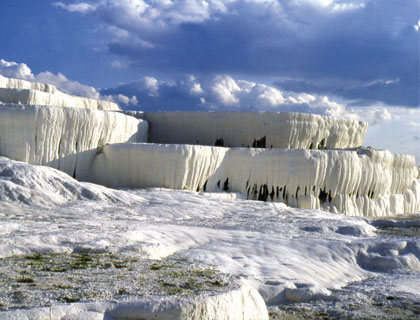 The city contains hot springs and travertine, terraces of carbonate minerals left by the flowing water. The ancient city of Hierapolis was also built on top of the "white castle".