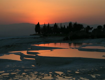 Pamukkale (Cotton Castle), a fairyland of dazzling white petrified castles, is a magical and spectacular natural site, unique in the world, situated by the ruins of sacred Hierapolis ancient city.