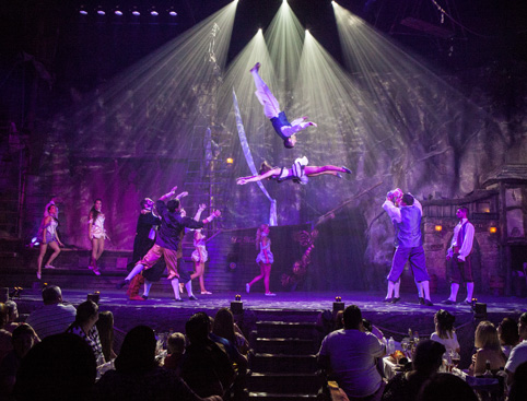 The Pirates Adventure Show and Feast More than 160000 people enjoy the Pirates Adventure Dinner Show each year and it's not hard to see why it's so popular. Suitable for all ages* this highly entertaining and interactive show features gymnasts dancers and world-class acrobats in a tale of pirates and adventure set on the high seas.