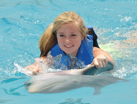 In addition, the Swim Adventure program includes the Belly Ride, where you will hold on to the dolphin’s fins as he rides backwards across the water.