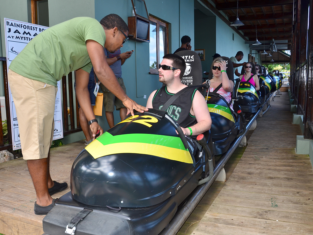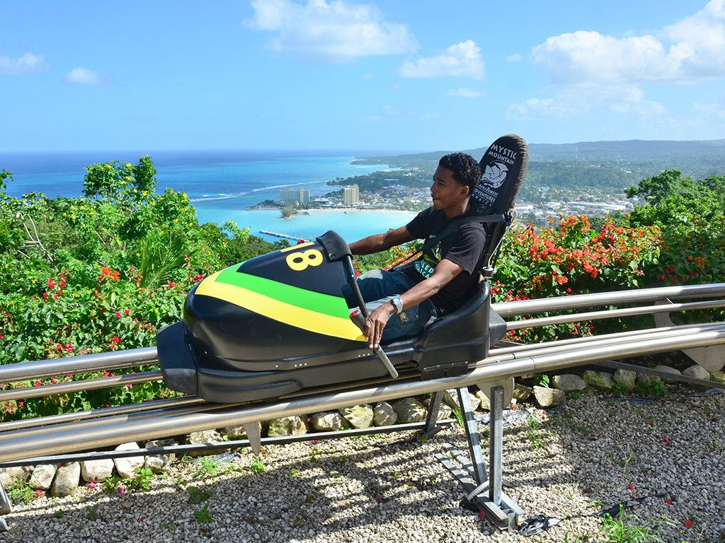 Hold onto your hat: this is one wild ride! Inspired by the famous Jamaica bobsled Olympic team, the bobsled ride in Rainforest Adventures Jamaica near the Dunn's River Falls is the park’s signature attraction, ranked by TripAdvisor.com as one of the top attractions in Ocho Rios Jamaica. Hold onto your hat: this is one wild ride! Inspired by the famous Jamaica bobsled Olympic team, the bobsled ride in Rainforest Adventures Jamaica near the Dunn's River Falls is the park’s signature attraction, ranked by TripAdvisor.com as one of the top attractions in Ocho Rios Jamaica.Hold onto your hat: this is one wild ride! Inspired by the famous Jamaica bobsled Olympic team, the bobsled ride in Rainforest Adventures Jamaica near the Dunn's River Falls is the park’s signature attraction, ranked by TripAdvisor.com as one of the top attractions in Ocho Rios Jamaica. You’ll be safely strapped into a custom-designed, high-tech sled and whooshed down a 1000-meter long track installed into the side of the mountain, completely driven by gravity: yes, Newton, it really works!