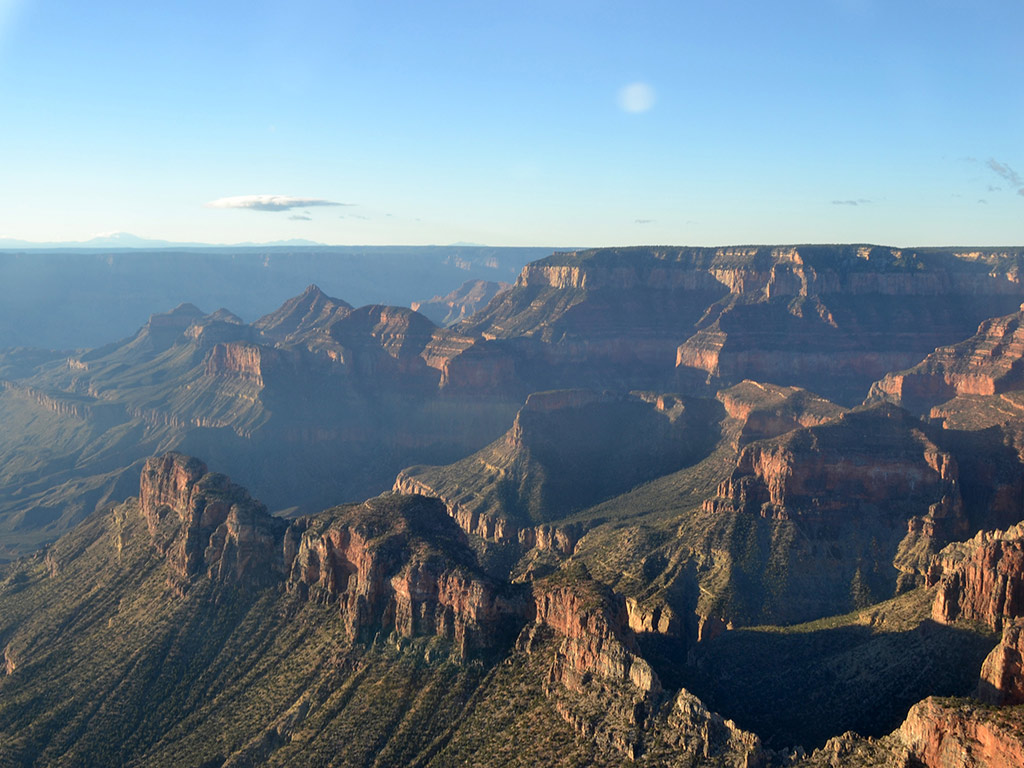 Ascend high in the sky by the South Rim over the beautiful Kaibab National forest, home to the world's largest Ponderosa pines, which have been known to grow to heights beyond 70 metres. As the helicopter reaches the edge of the canyon itself, the rim gently drops away as the North Rim and the eastern edge come into view, offering a panorama of stunning contrasts.