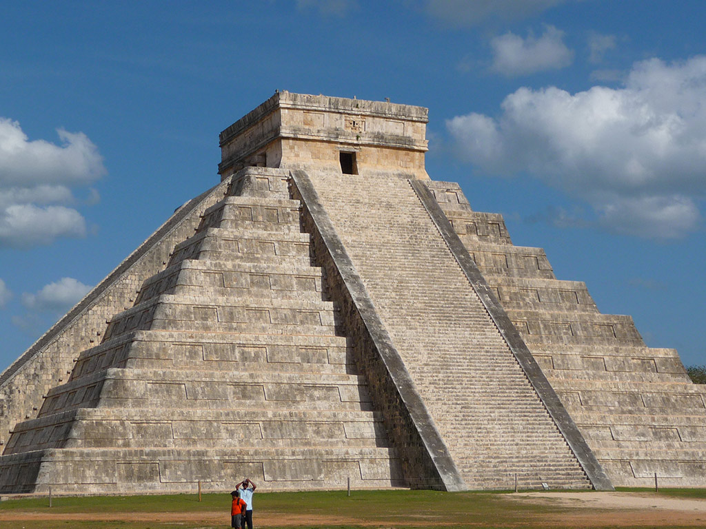 The building has remained in place since the time of the Mayans and is a fascinating example of Mayan culture. Mesoamerican cultures occasionally built larger pyramids on top of smaller ones and this is the case for El Castillo, where an excavation discovered a temple with an elaborate jaguar throne. At sunrise and sunset on the Spring and Fall equinoxes, the corner of the pyramid casts a shadow of Kukulkan, a feathered serpent god, creating the illusion of a snake slithering down the North side with the sun’s movement.