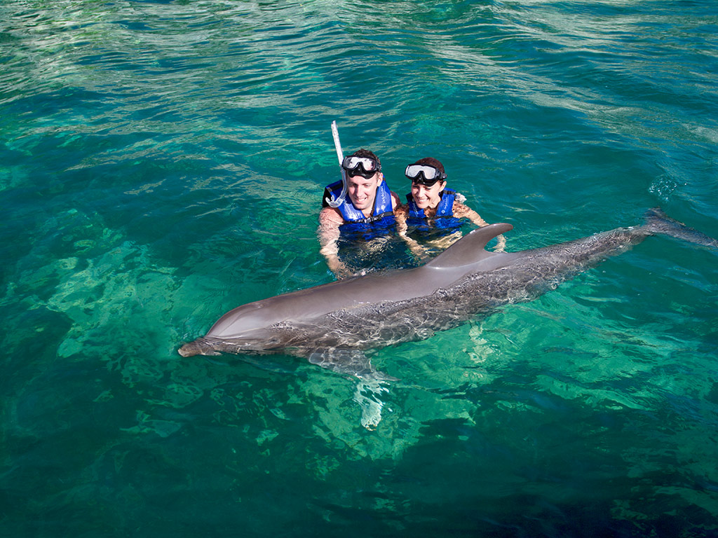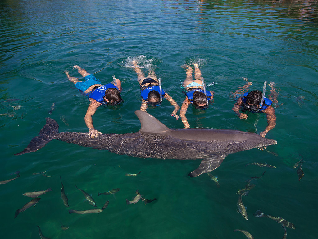 Dolphin Ride: Swim free with the dolphins, salute them, hug them, play with them and get a dolphin kiss! 11 different activities to learn and have fun. 10 people maximum. Duration: 45 min: 30 min. In the water and 15 min. Training.*