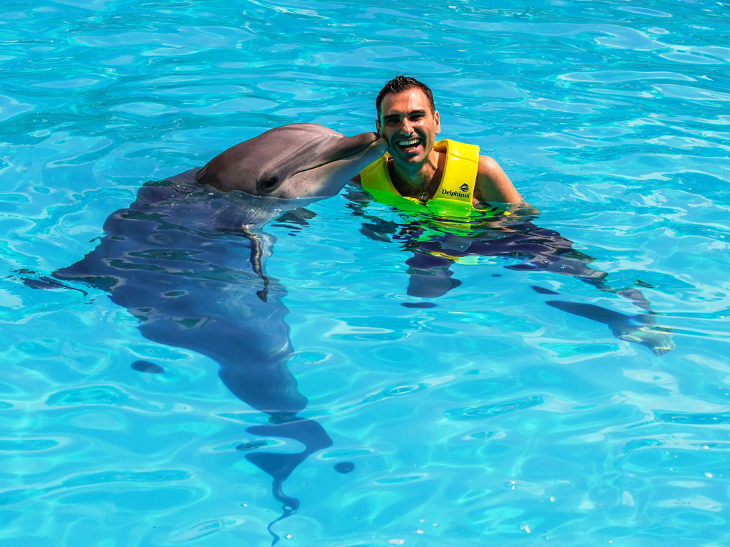 Share with your family and friends a unique and memorable interaction with the dolphins. Have fun with 14 different activities like kissing, hugging, touching and much more. 10 participants per group.