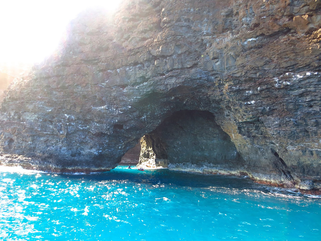 Observe the towering 3,500-foot high cliffs, lush green valleys, cascading waterfalls, mysterious sea caves and pristine beaches along this remote wilderness coastline. The Lucky Lady vessel offers prime viewing of Na Pali from the bows to stern with seating all around the main deck, on the upper observation deck and shaded cushioned seating in the lower protected cabin area.