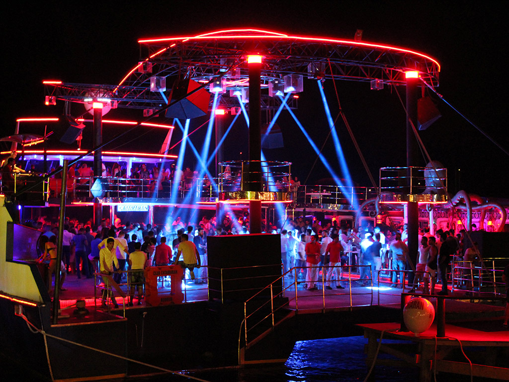 The catamaran holds a capacity of 2500 people in total with the specially designed party boat, the port where the party begins and the club facilities. The boat itself, which carries the great pleasure to the middle of the water, holds a capacity of 2000 people. It is also the best sun & sea party boat in Bodrum. Cruising along the most beautiful coves of the peninsula, clubbers enjoy the daytime and sunset and keep the party on until the next morning. This catamaran is also favored by the ones who want to make a difference while throwing a wedding or birthday party. In every 10 minutes till morning, there are free of charge speed boats that carry you to the catamaran and also take you back.
