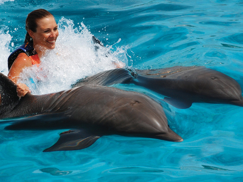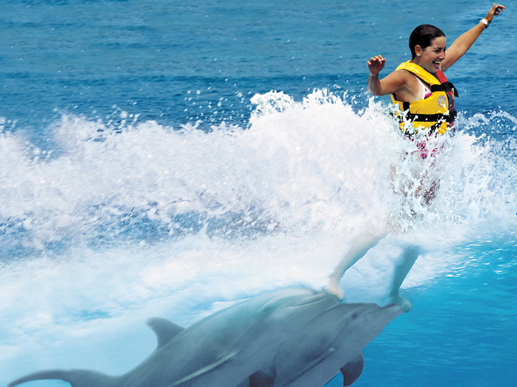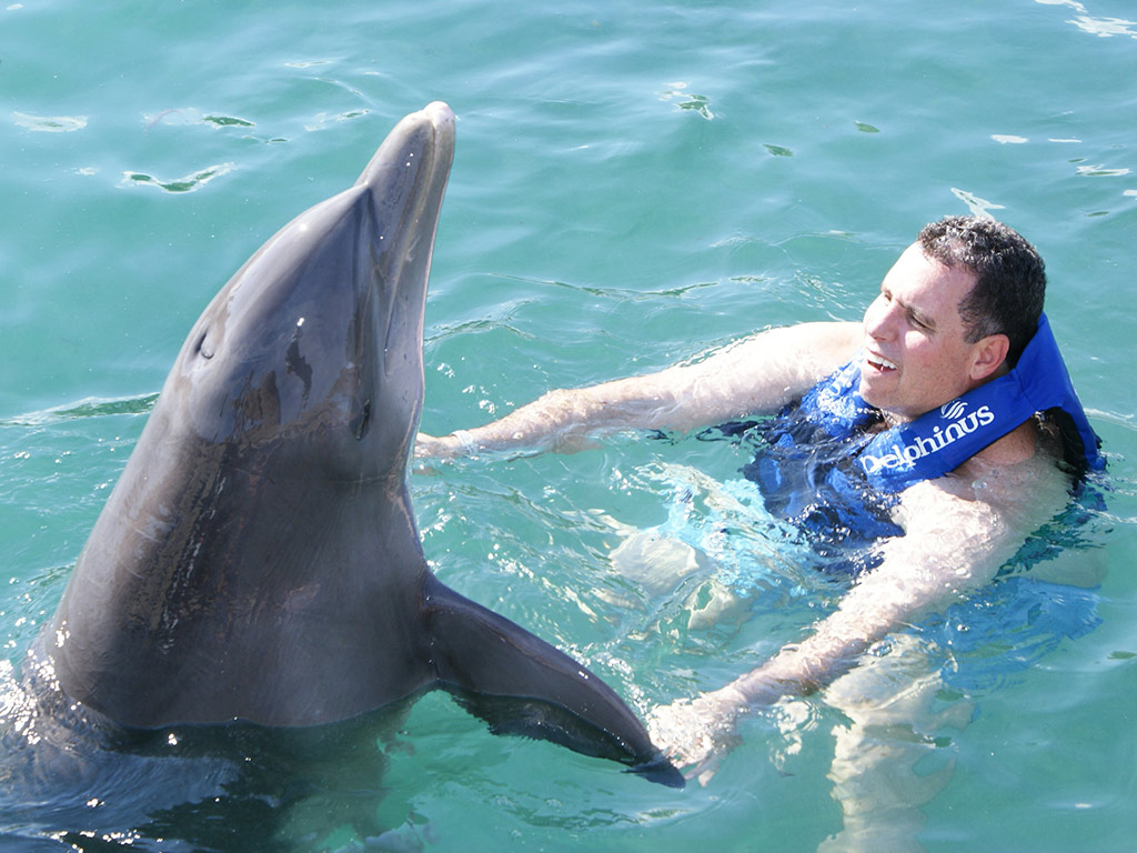 Beginning with an orientation session, you are first provided with background educational information about the dolphins before being given specific instructions on safety. The dolphins will conquer your heart before you even get in the water as you watch them swimming along and showing off all their tricks. Feel the rush as you are pushed through the water by your feet by the powerful and skilful dolphins. Perhaps hang onto one of the dorsal fins for a dorsal tow. The dolphins will astound you by performing acrobatic feats with you such as jumping over you. A portion of the water time will also be dedicated to “free time”, where guests can interact more spontaneously with the dolphins allowing everyone a very personal experience.