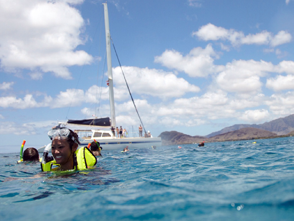 Cruise the beautiful Leeward Oahu coast to view dolphins, turtles and other marine life including whales from December to April. Snorkel at a calm anchorage and see the vibrant sights just beneath the surface.