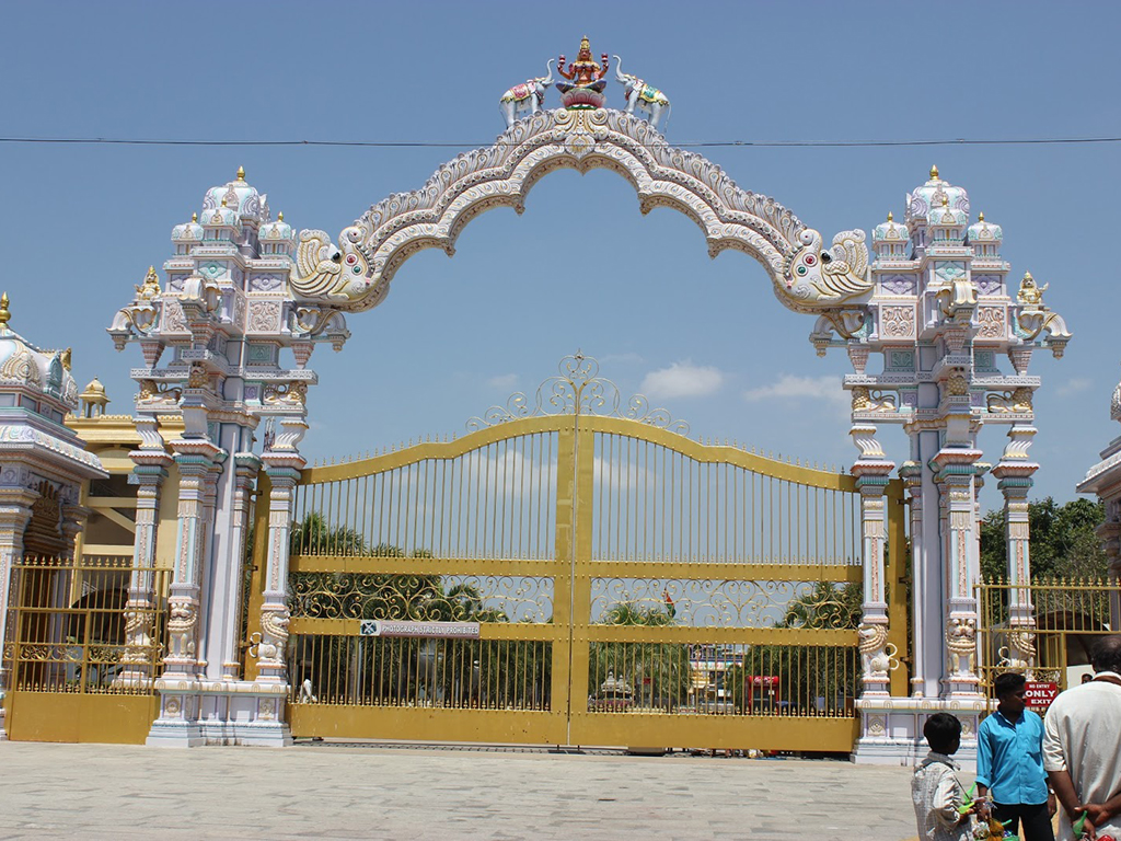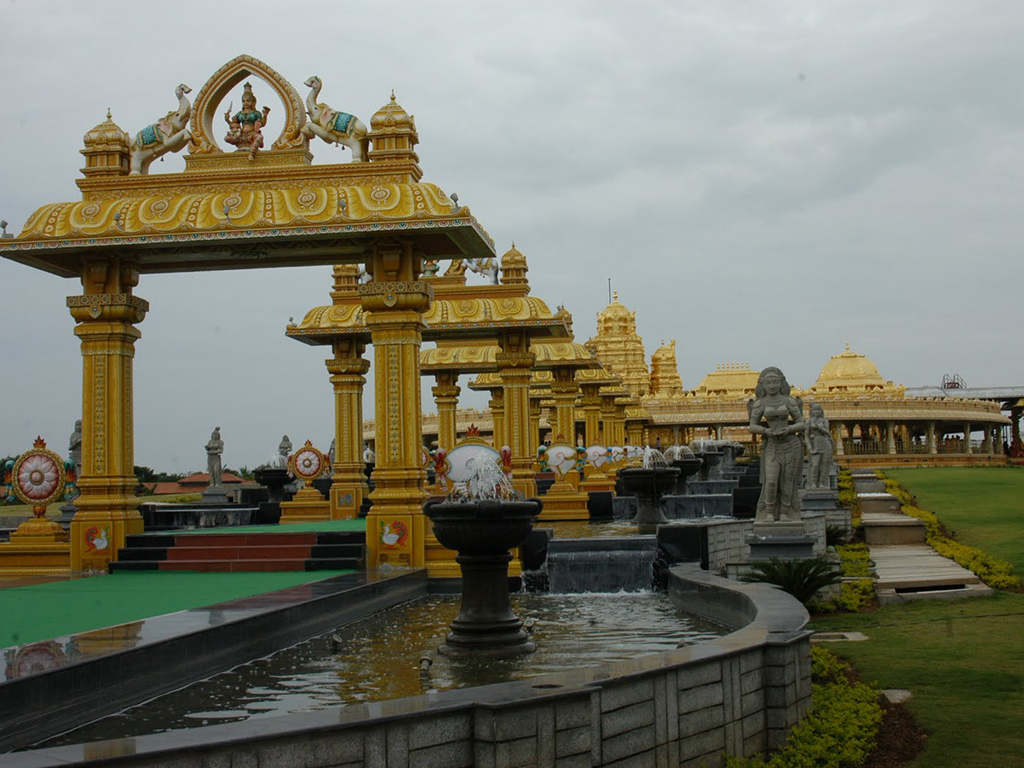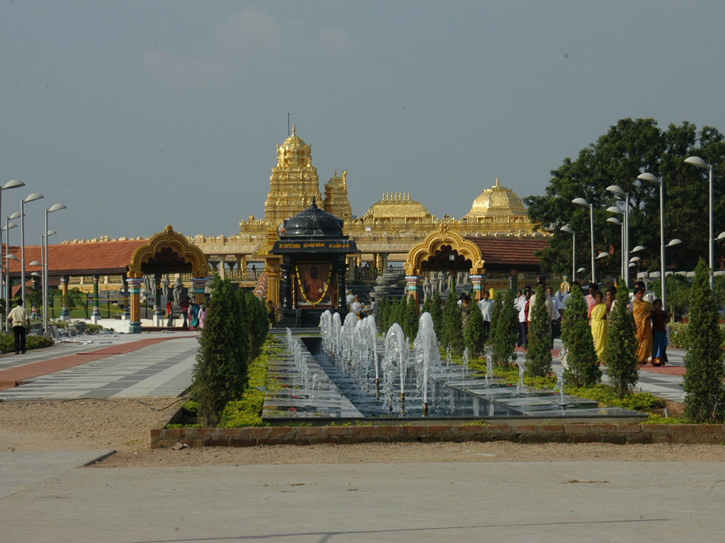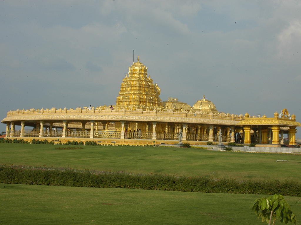 The golden temple of 'Sripuram' is a spiritual park situated at the foot of a small range of green hills in a place known as "Malaikodi" in the city of Vellore in Tamil Nadu, India. The salient feature is the Lakshmi Narayani temple or Mahalakshmi temple whose 'Vimanam’ and ‘Ardha Mandapam’ The temple with gold covering, has intricate work done by artisans specializing in temple art using gold. Every single detail was manually created, including converting the gold chunks into gold foils and then mounting the foils on copper. Gold foil from 9 layers to 0 layers has been mounted on the etched copper plates. Every single detail in the temple art has significance from the vedas.