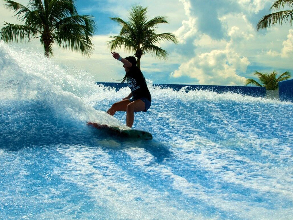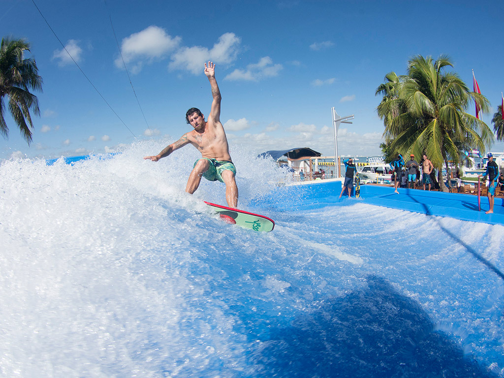 Thrills. Safety. Comfort. Ease. These are some of the words that can best describe AquaWorld‘s new and amazing FlowRider. It’s the first one to open to the public in Cancun and the fifth one in all of Mexico. Come experience the perfect mix of fun, party, skate and surf; under the sun and under the moon. Thrills. Safety. Comfort. Ease. These are some of the words that can best describe AquaWorld‘s new and amazing FlowRider. It’s the first one to open to the public in Cancun and the fifth one in all of Mexico. Come experience the perfect mix of fun, party, skate and surf; under the sun and under the moon.The FlowRider is a wave-forming generator on an inclined surface, and it’s awesome fun regardless of your age, shape, size and ability. It comes equipped with a concession stand and a store focusing on water sport products. The FlowRider provides complete safety and ease for all users, given that its surface is really soft, resembling a trampoline.