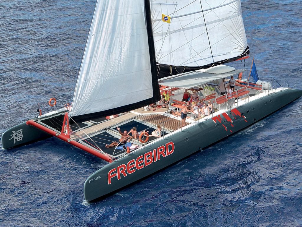 You will spend the day lapping up luxury on this tailor-made boat. The boat has rather a decent size complete with a 38 metre high sail and it has copious amounts of space, in fact it boasts 620 square metres of it. The big and beauteous boat comprises of two large decks and thus can hold up to 196 people. Whether you prefer to lull in the shade of the fly bridge, catch the rays in the netting area which is located at the very front of the Catamaran or cool down in the comfy indoor lounge; it’s really up to you.