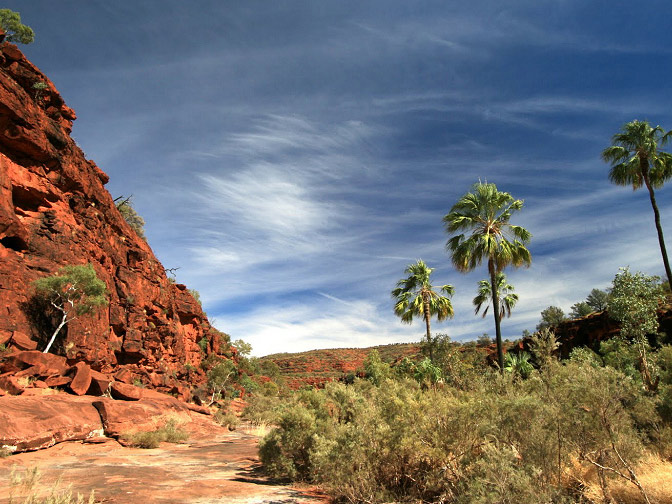 See spectacular rock formations, white sands and an oasis of rock pools and palm trees. Some plants, such as the cycad and Livistona Mariae are known worldwide as relic plants and are unique to Central Australia.