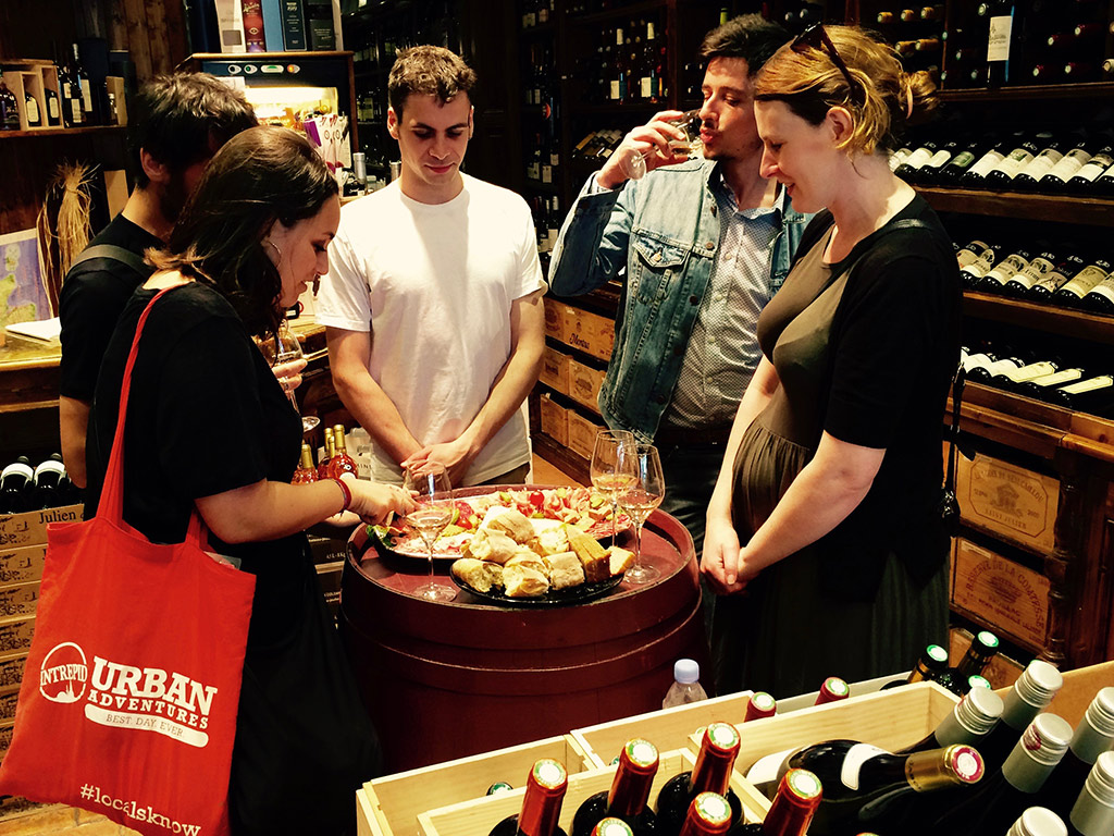 Our Paris tour will then take us back to the South Marais, where stands the longest remaining piece of the 12th century defensive wall of Paris. After a walk through impressive Saint-Paul’s church, we’ll stop in a local wine and alcohol store, where we’ll sample some iconic French liqueurs like Cognac, Armagnac, Absinthe, and “Old Plum” brandy. To accompany our drinks, we’ll also taste some delicious French charcuterie treats: one of the best hams in France, pâté, rillettes, and other indulgences.