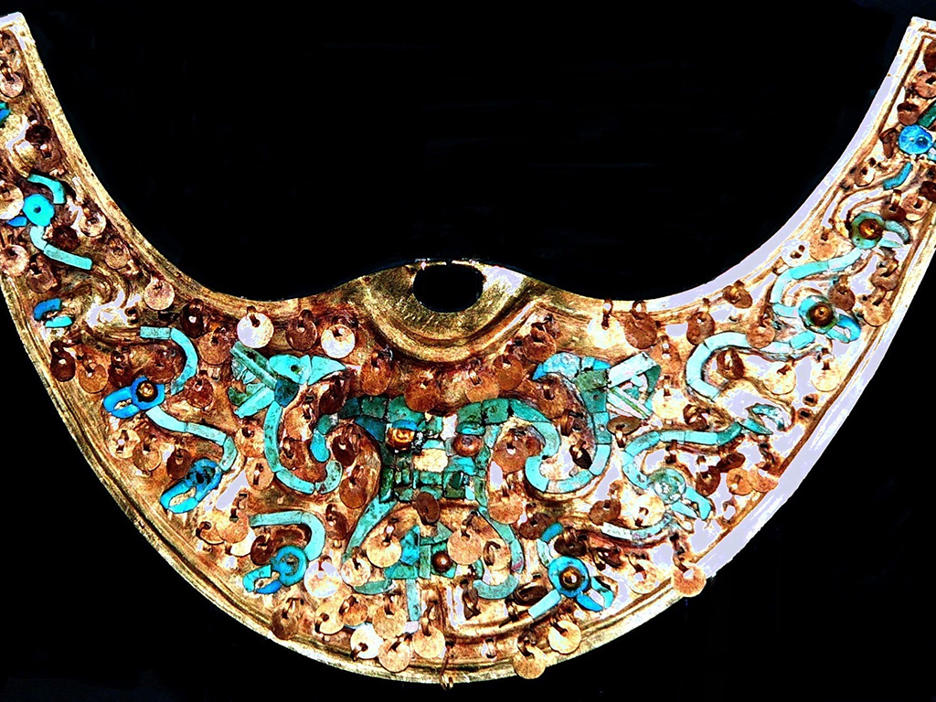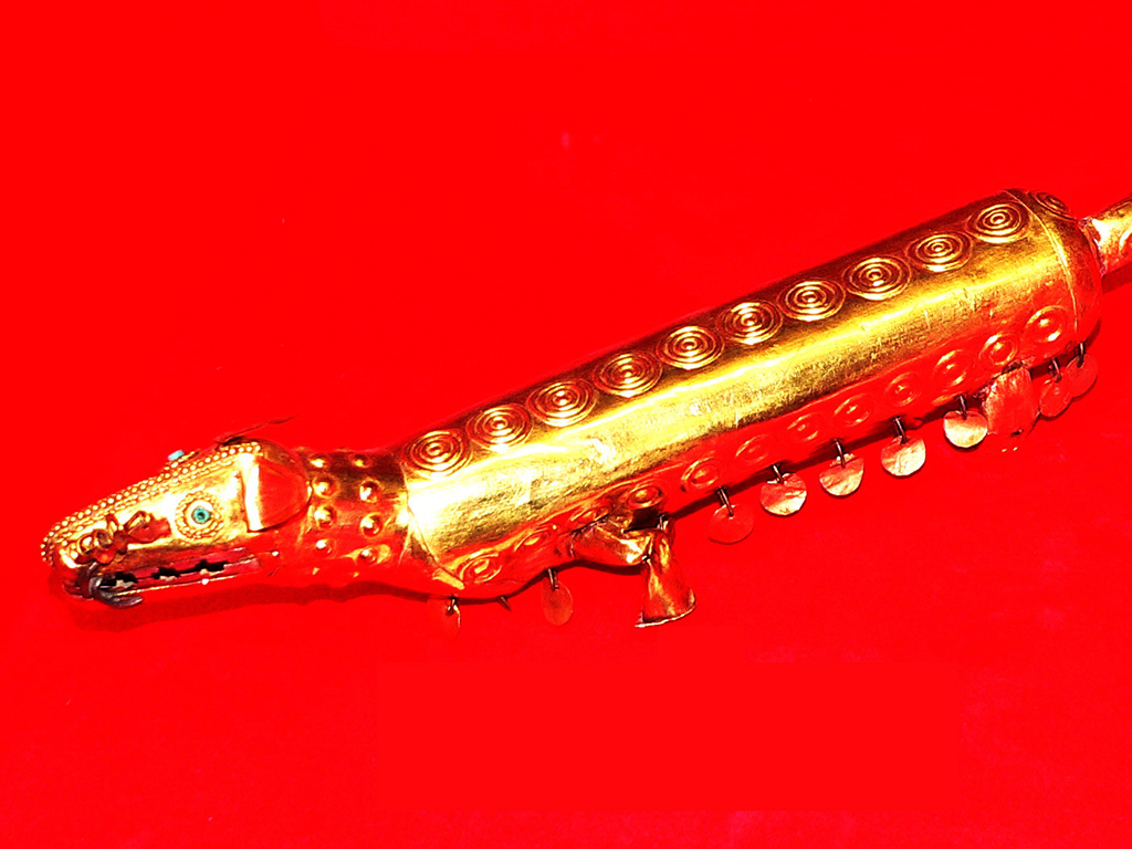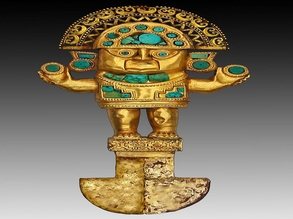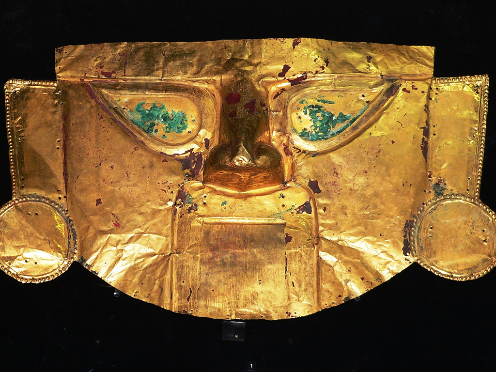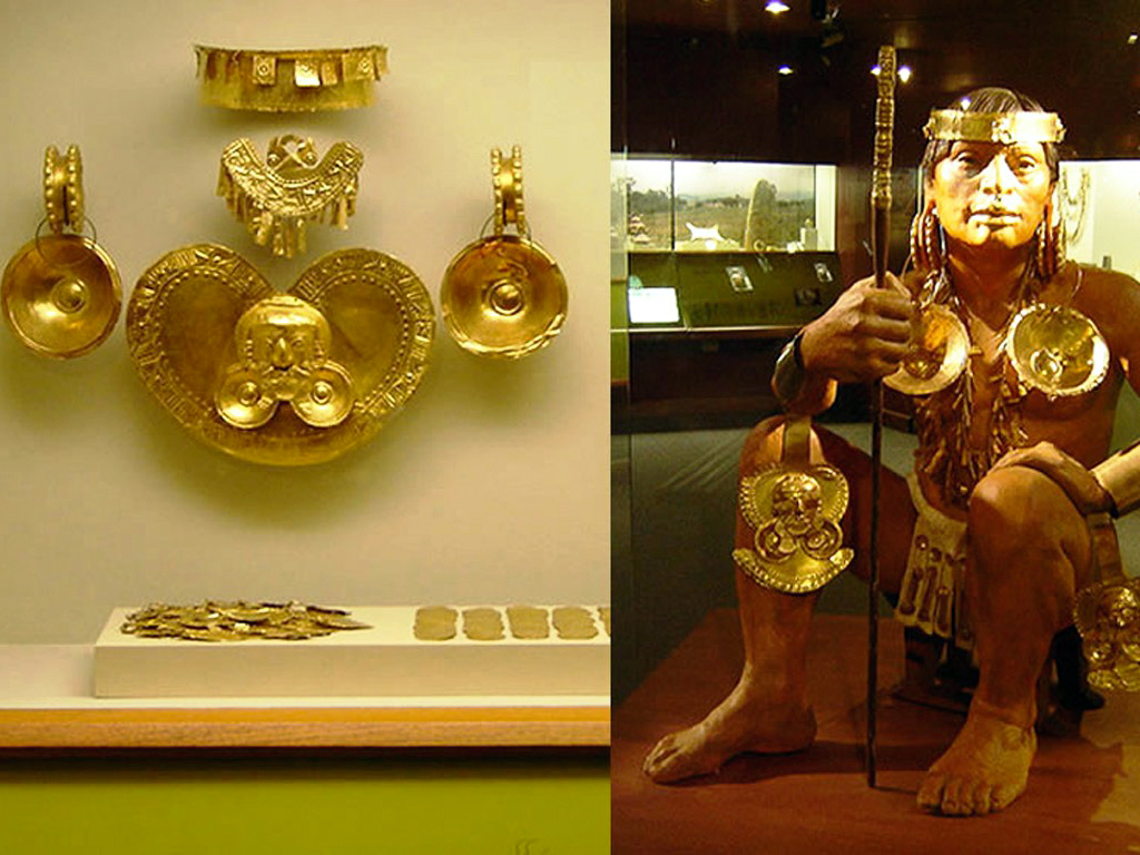 The showcases of the “Gold Museum of Peru” display the craftsmanship of several centuries of Peruvian history, mainly in pre-Inca gold. There are decorative items of all the cultures, such as, embossed and weaved nose ornaments with cut stone pendants; sets of filigree figures depicting birds, men, or monkeys; mantles, bracelets and earflaps of the Vicus culture; lizards, weasels, felines, bags of coca leaves, earrings and belts of the Frias culture; pectorals with zoomorphic designs, flat or embossed crowns of the Chancay culture; funerary masks with twisted rays or serpents from Ica; and masks with open mouths and teeth, wristbands, shin protectors and spatulas of the Nazca culture.