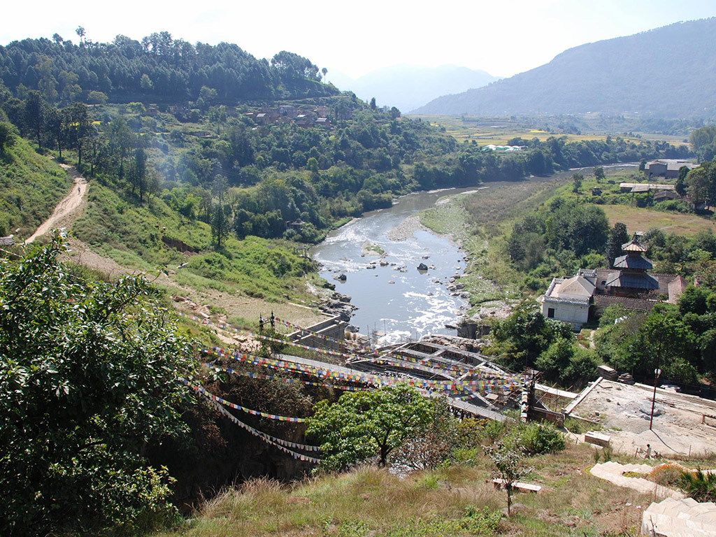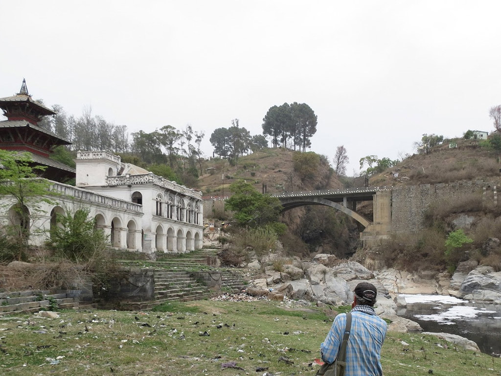 Chovar gorge, the only outlet for all the water of the valley. Legend has it that Manjushree, an ancient saint from China, cut the mountain with his magical sword to drain out the water from the Kathmandu Valley Lake to make it habitable. There is a small but picturesque temple of Adinath on the top of the hill with a magnificent view of the snowcapped peaks. Just beyond the gorge is a temple of Lord Ganesh. The main image of the shrine is a massive rock, naturally carved.