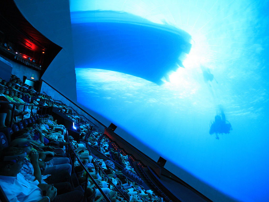 The Imax dome serves as the ‘pupil’ of the eye and the ‘eyelid’ opens and closes by means of hydraulic lifts, which operate the steel and glass shutter. The building itself is surrounded by a massive pond, the bottom of which is glass, creating the illusion of the eye as a whole. The interior boasts a delightful little effect that allows you and a friend to stand at two opposite pillars inside the eye that allow you to talk with each other as if you were side by side.
