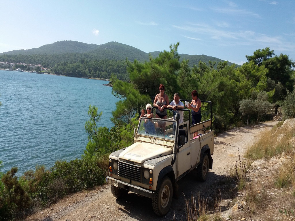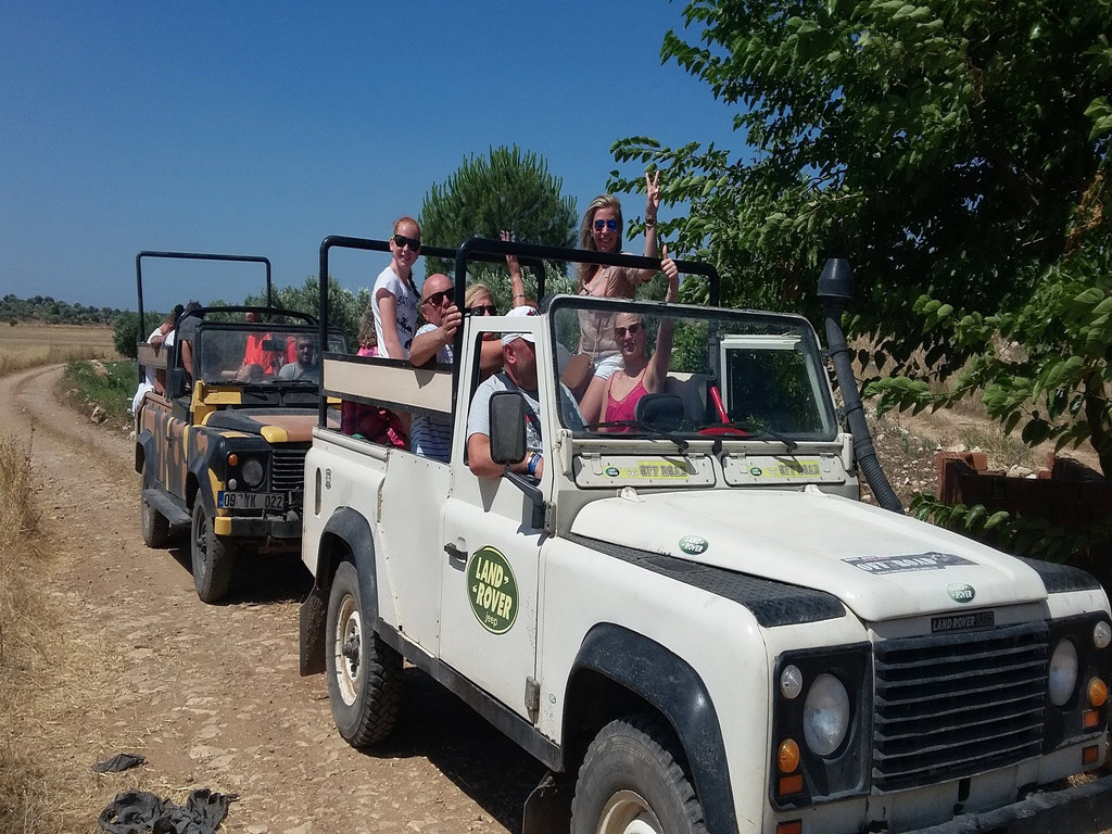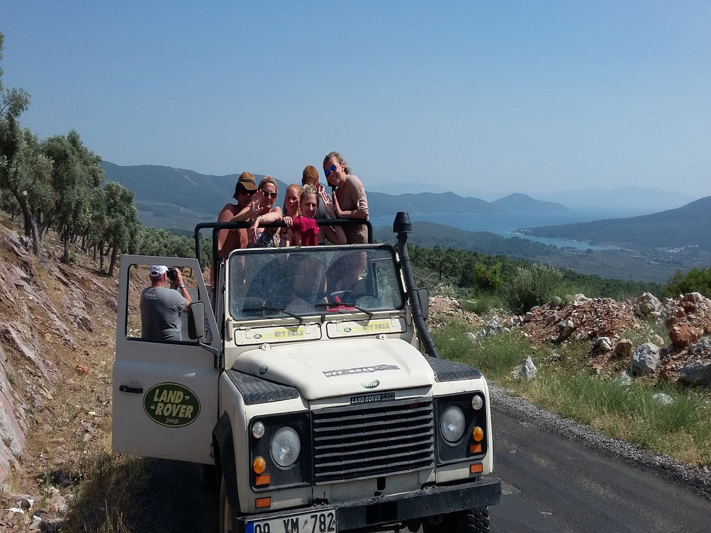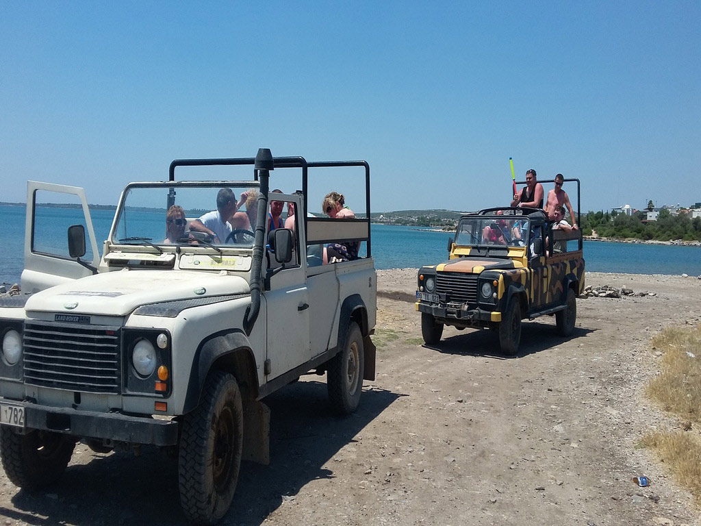 Leaving the resort and driving for a short while, you arrive at a horse-farm with a nice cafe and swimming pool.There you have a swimming and sun-bathing break.Guests have lunch of their choice from chicken,meatballs or omlette and after lunch, the drive starts again in and near forests and by the sea-side untill you get to Bozbuk bay,where you have another swimming break at that beautiful beach.On the way back, another swimming-stop awaits you in Akbuk (White Bay).On the day there awaits you water-wars ! (The day is full with water,dust and fun,join with swim-wear,water-guns are available on the jeeps at low prices or you bring yours).