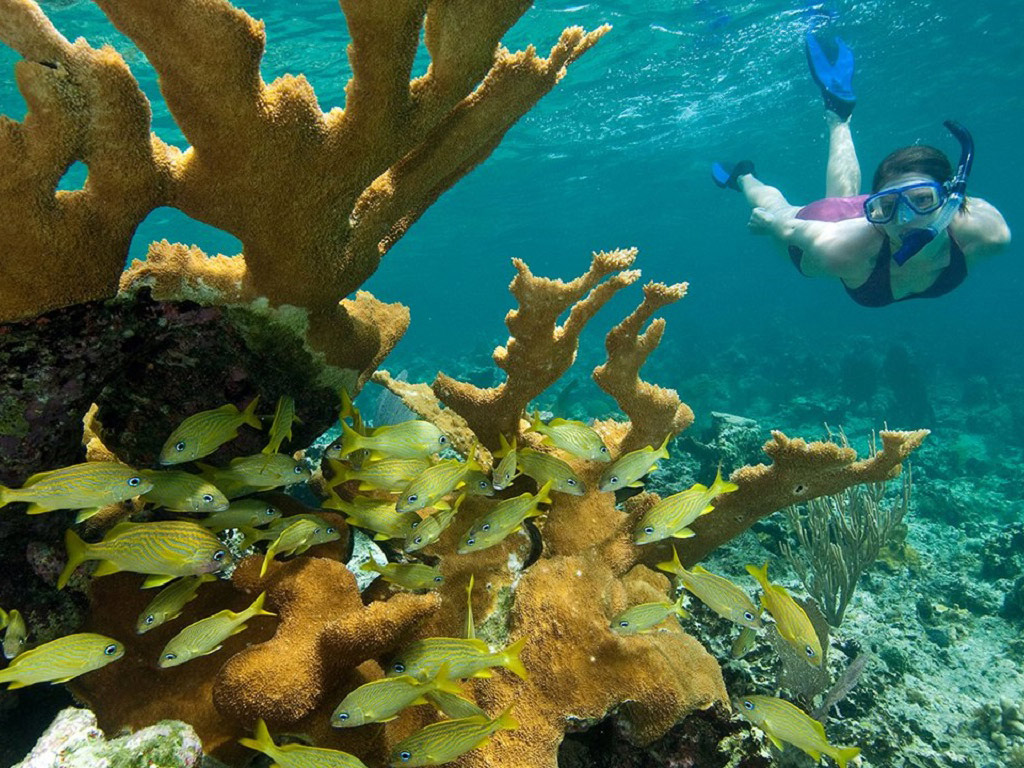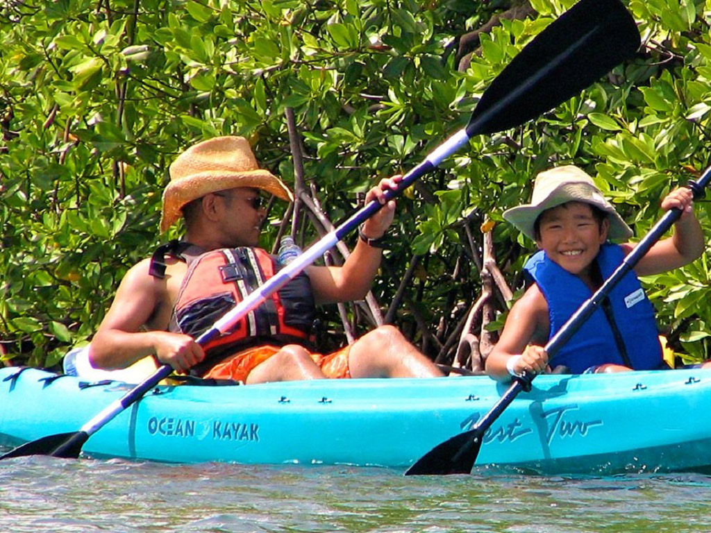 From this tranquil setting, enjoy a ten minute paddle through romantic mangrove alleyways looking out for nesting pelicans and eagle rays swimming in the shallow waters below. Be sure to paddle slowly as you pass over the several shipwrecks in route to Cas Cay. Upon arriving at the wildlife sanctuary of Cas Cay, a deserted tropical island consisting of 15 acres of mangrove forest to the south and volcanic cliffs to the north, enjoy a hermit crab race. You will learn about the importance of the mangrove eco-system, and how to identify the various tropical plants and their edible and medicinal uses. Then, enjoy a fifteen minute leisurely stroll along a scenic coral and shell rubble beach.