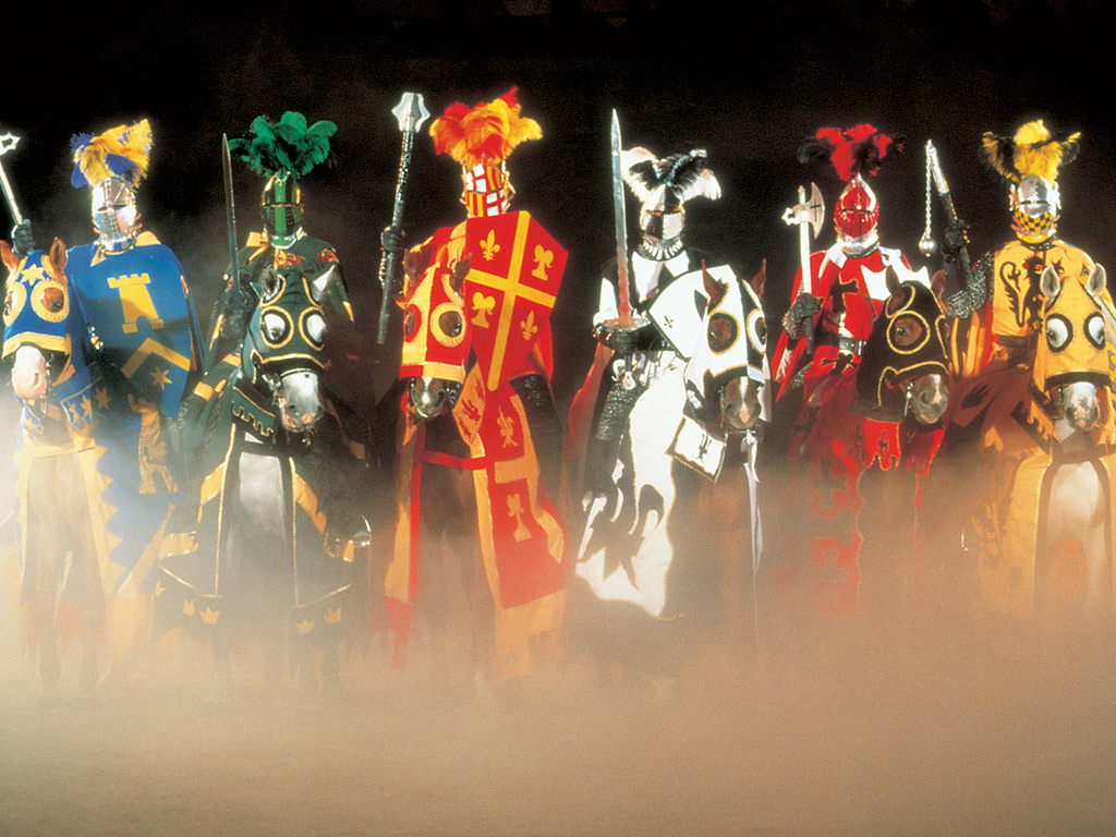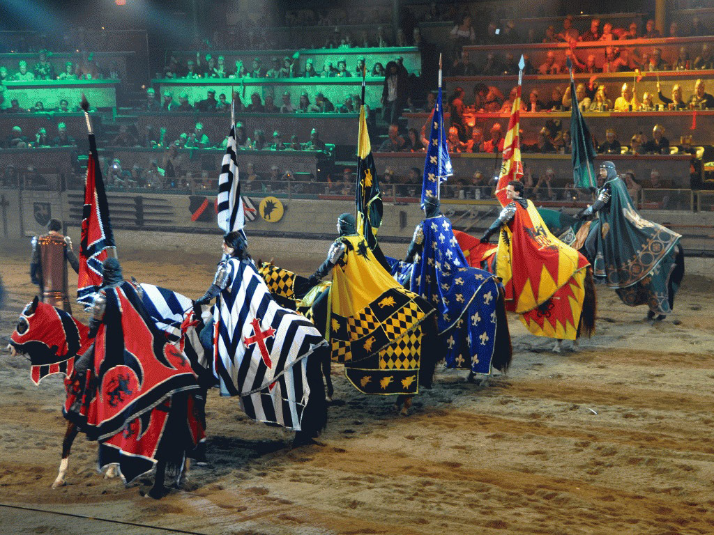 As the festivities begin, trumpeters herald you into the Grand Ceremonial Arena where you are seated in one of the six color-coded sections corresponding to the colours of one of the daring Knights. Serfs and wenches attend to your every need while you feast on a four-course dinner in true Medieval, pre-silverware fashion.