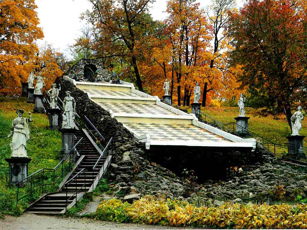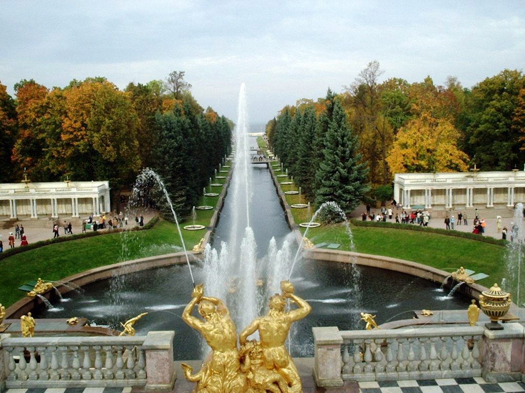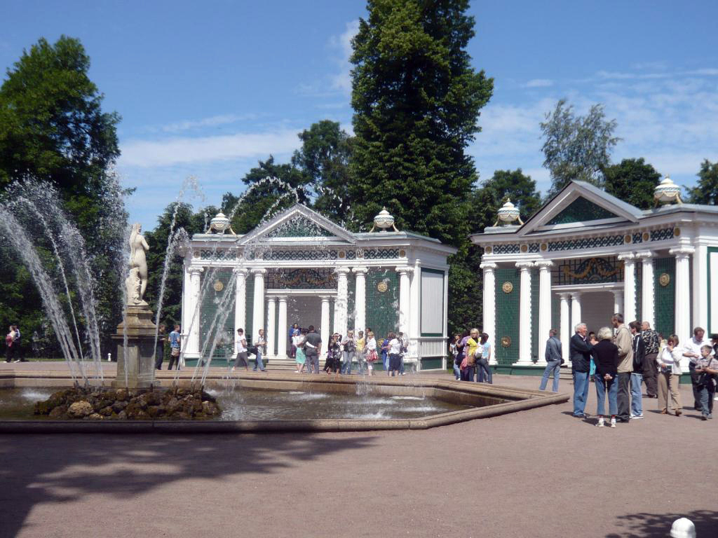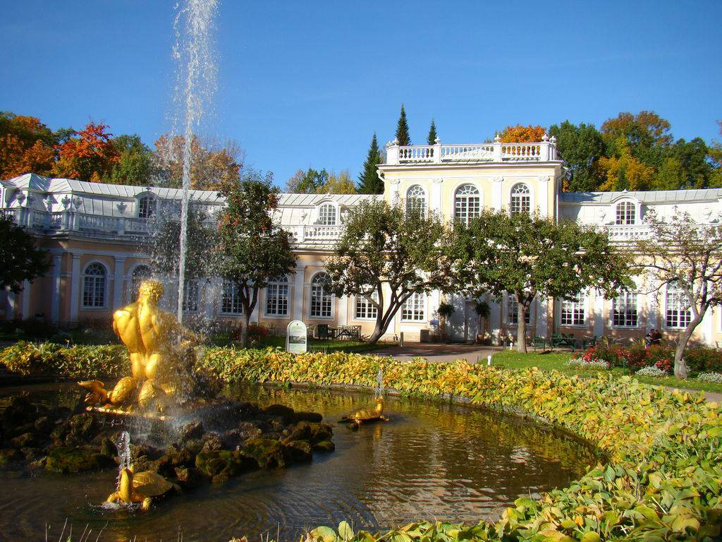 Other buildings on the site are the original Monplaisir Palace and the small Marly Palace, which was modelled on a French hunting lodge. There is also a hermitage, something very much in vogue across Europe at the time, and a Gothic revival chapel. The lower park features lakes and a Garden of Venus filled with fruit trees and statues, and a Garden of Bacchus. The Upper Gardens display beautiful flower beds, topiaries and fountains.