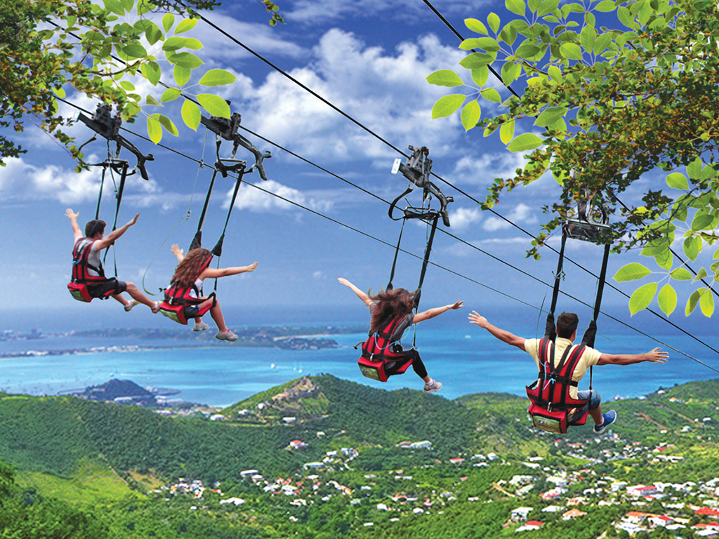 The most exciting new thrill rides in the eastern Caribbean in one tour! Glide to St. Maarten’s highest point on the Pirate Sky Ride then go flying back down the mountain on the world’s steepest zip line, The Flying Dutchman. Re-ascend and Zip Line over the mountain ridge enjoying the stunning views of beautiful St. Maarten. The most exciting new thrill rides in the eastern Caribbean in one tour! Glide to St. Maarten’s highest point on the Pirate Sky Ride then go flying back down the mountain on the world’s steepest zip line, The Flying Dutchman. Re-ascend and Zip Line over the mountain ridge enjoying the stunning views of beautiful St. Maarten.The most exciting new thrill rides in the eastern Caribbean in one tour! Glide to St. Maarten’s highest point on the Pirate Sky Ride then go flying back down the mountain on the world’s steepest zip line, The Flying Dutchman. Re-ascend and Zip Line over the mountain ridge enjoying the stunning views of beautiful St. Maarten. Then your top-to-bottom tour finishes with the Schooner Ride sending you surfing down the mountain in an inner tube. You will be guided to the plantation house, built in the 1700s, to learn the powerful story of Trace Wilson, born into slavery on the estate in 1818 and his descendant Emilio Wilson who purchased the property to educate current and future generations about the conditions of plantation life as well as the customs, traditions and history of St. Maarten, “The Friendly Island.” Embark the Pirate Sky Ride for the approximately 25-minute ride to the Crow’s Nest atop Sentry Hill, St. Maarten’s highest elevation at 1,125 feet. A series of platforms encircle the mountaintop showcasing 360-degree views of the whole island including vistas of neighboring islands Saba, St. Eustatius and St. Barts and Anguilla. A brief orientation will prepare you to fly down the mountain at speeds of up to 56 miles per hour on the world’s steepest zip line, The Flying Dutchman. You’ll be attached to a flight line in a secure harnessed chair, launching you on the 1050-foot drop in elevation over 2630 feet to experience the ride of a lifetime. Embark the Pirate Sky Ride for your journey up to the Pirate Deck. After your orientation, you will put your safety equipment and harness system for your Zip Line flight over the mountain ridge. To complete your top-to-bottom thrill ride, the Pirate Sky Ride will take you to the Schooner Ride where you’ll surf down the mountain in an inner tube through the curves and straightaways of a specially designed track. After your fun-filled adventure, select your favorite photo and video then enjoy exploring the Estate and sampling St. Maarten delicacies, snacks and beverages at the restaurant.