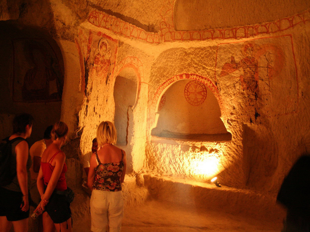 The last stop is at Kaymakli Underground City; there are more than 100 Underground cities in Cappadocia, once used by the local people to hide from marauding armies. İn these days only 4 of them are open to the public. We visit one of them to experience life thousands years ago; the number of storage rooms in such a small area supports the idea that a great number of people resided here. Archeologists think that this could have been up to 3500 people.