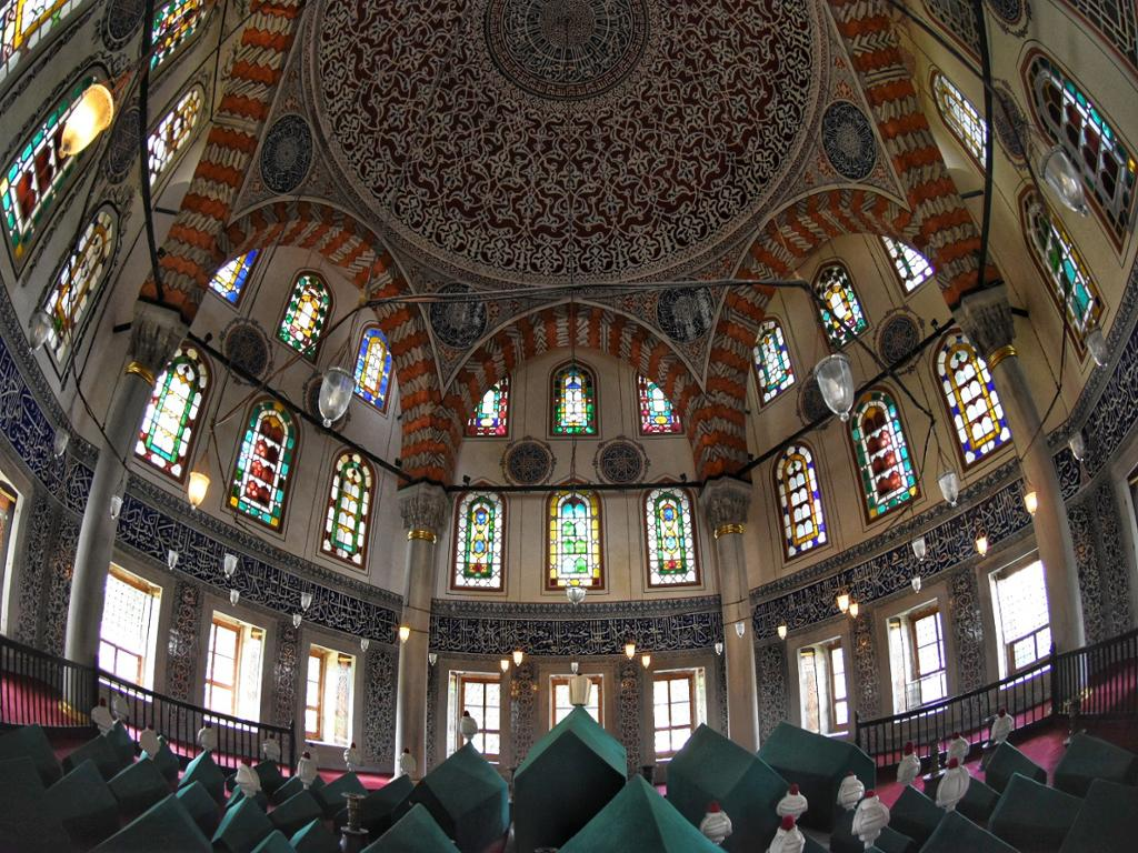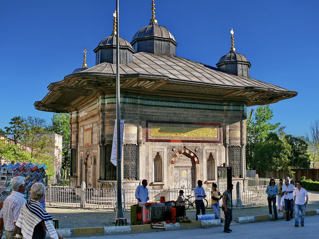 Proceed to the stately courtyard of Hagia Sophia, home to the Sultans’ mausoleums which have recently been restored to their former glory. Mehmed III, Selim II, Murad III, Ibrahim I, Mustafa I and all their families were laid to rest here. The interiors of the tombs are adorned with some of the most beautiful ceramic panels of the 16th century with purple, red, green and blue flower motives. Prince’s robes and a small piece from the Kaaba covers are displayed on the sarcophaguses.