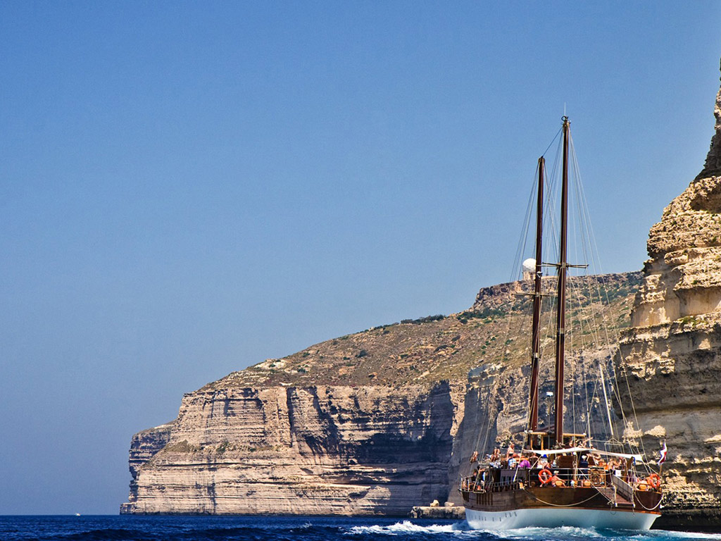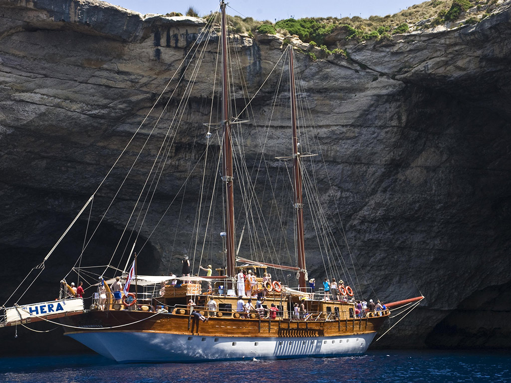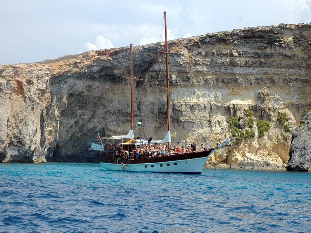 Full day cruise around the Maltese Islands. Faith is a beautiful 26.5 metre long Schooner Rigged Turkish Gullet with a large forward deck, covered stern deck and a large saloon. Faith departs from the Sliema Marina and cruises North westwards towards Gozo. We drop anchor in a secluded bay in Gozo. En-route one sees the panoramic cliffs, coves and inlets.