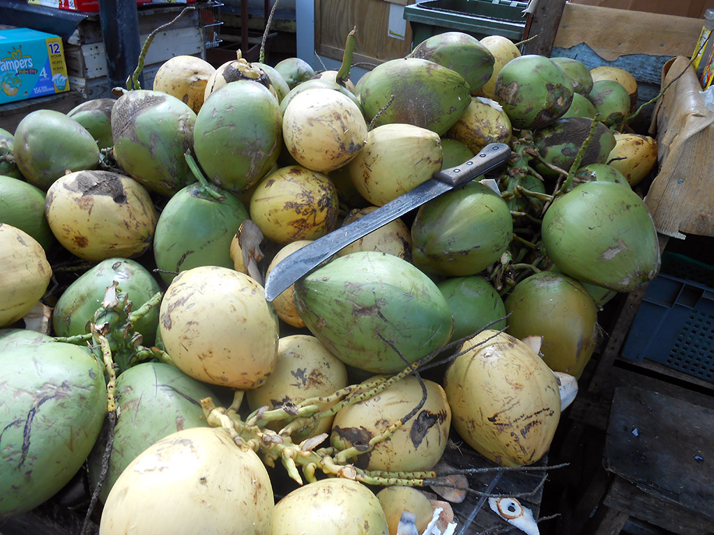 A man who appears to be wearing a basket is selling immature coconuts to drink the water from. Crabs are writhing around, their legs tied.