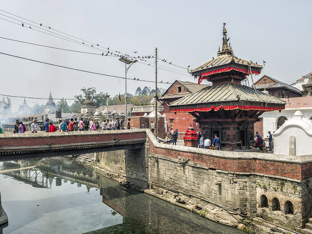 The main temple within the complex is of pagoda shape with golden roof and silver doors on all the four sides of the temple. Inside the temple is a Shiva linga with four faces of Shiva, with four different names and significance. Pashupati area is regarded as one of the most important places of pilgrimages for Hindus. Thousands of devotees from all around the world come to Pashupatinath every day. The temple is barred to non-Hindus, but one can get a good view of the temple from the opposite bank of the river. Every evening aarti (light offering) to Lord Shiva is performed which can be observed from across the river. The view of Arya Ghat (cremation ground only for Hindu) is also possible from the spot.
