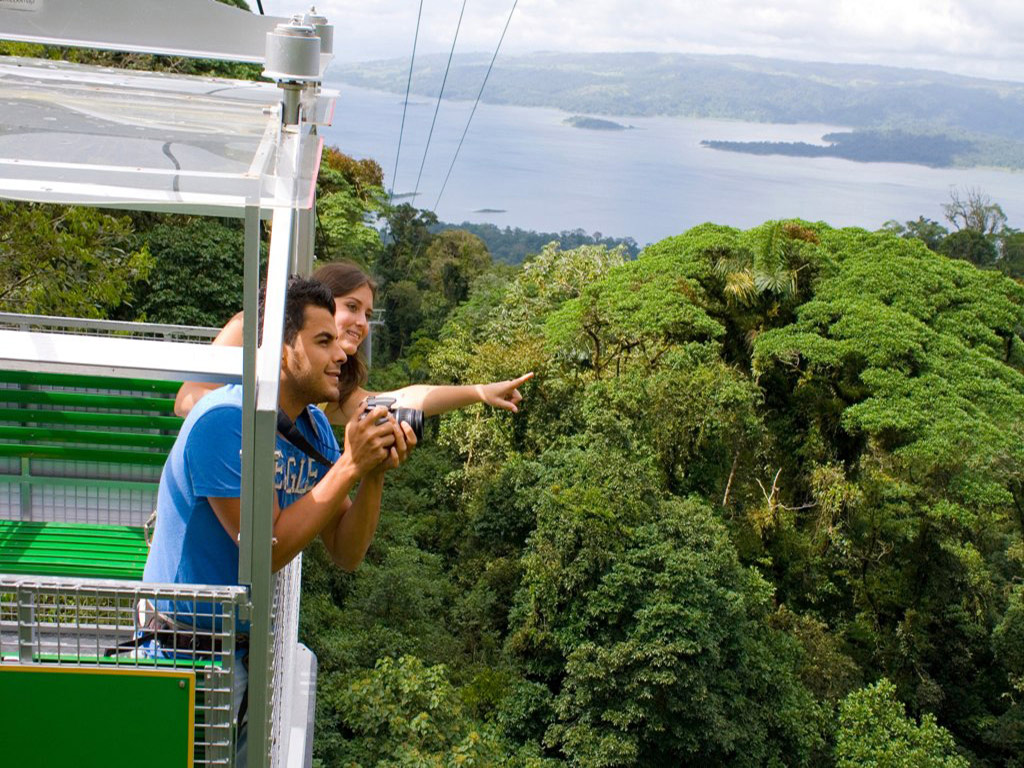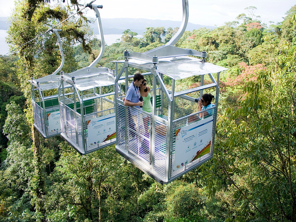 The Sky Tram tour reaches an observation area at the highest point of the Arenal Reserve, from where you can admire the natural beauty of the rain forest, the volcano and lake the end the sky tram continue the Sky Trek is a tour of adventure full of adrenaline high above the treetops, allowing you to observe the rainforest at its best and stunning views of the Arenal Volcano and the Arenal Lake. The tour includes 8 cables with distances up to 2460 feet and a maximum height of 660 feet. The zip lines and tram are complementary: you cannot do just the zip lines.