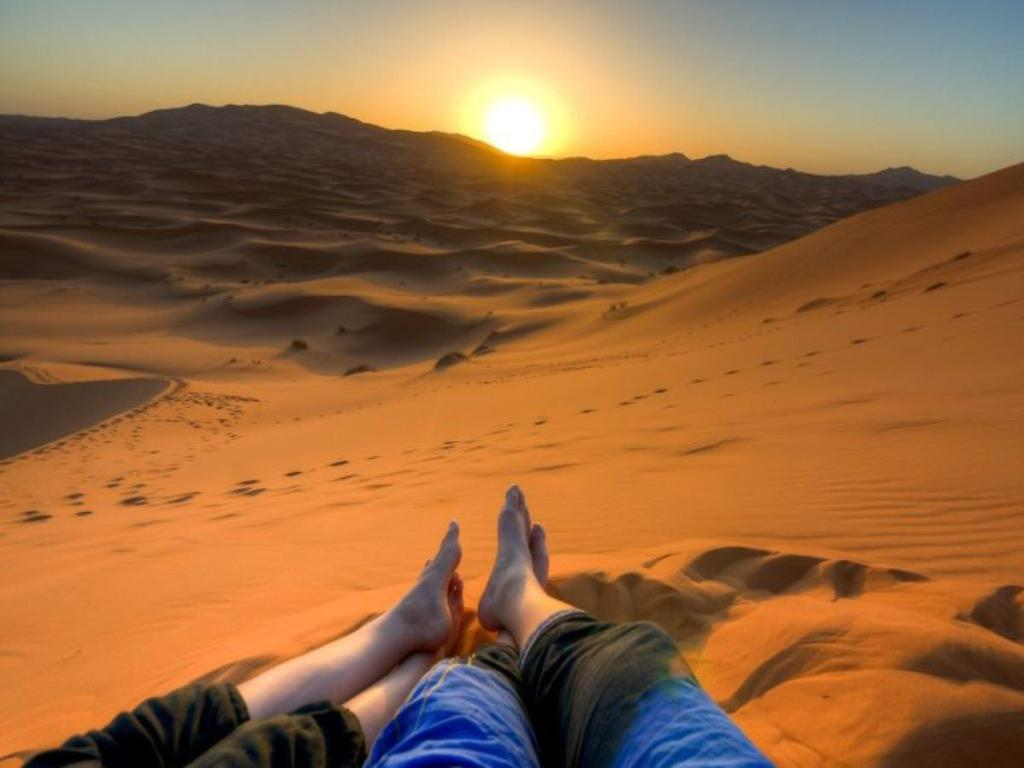 Witness the mesmerizing view of the initial rays of the golden sun amidst the sandy dunes, painted in vibrant hues. Feel the exhilarating, serene splendor of the sunrise as the beams of light are cast on the sandy slopes of the desert, bringing everything to life.