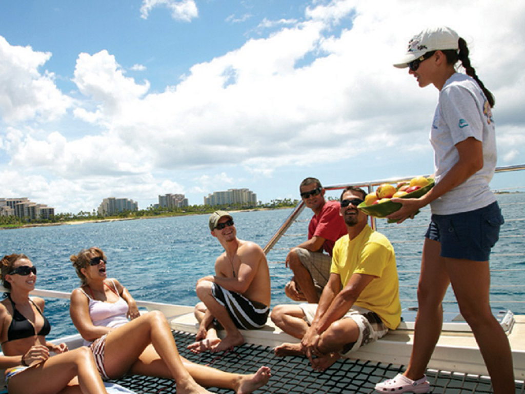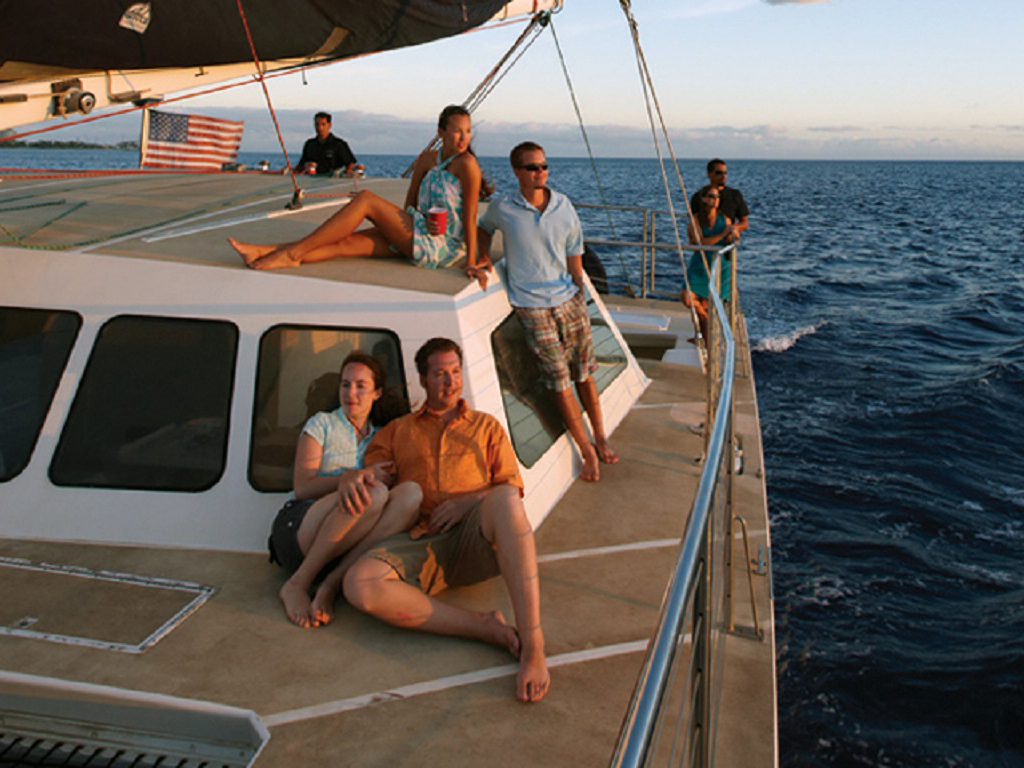 Join us for a fun-filled tropical evening! There’s nothing like a Hawaiian sunset, and nothing beats seeing a sunset at sea. You’ll feel right at home on this cruise. Our friendly crew will welcome you to share the spirit of Aloha as you discover the pleasures of paradise .This is perfect for a romance or a night out with friends and family. You will also enjoy an array of “pupus” and unlimited non-alcoholic beverages. Two free bar drink tickets are included per adult.