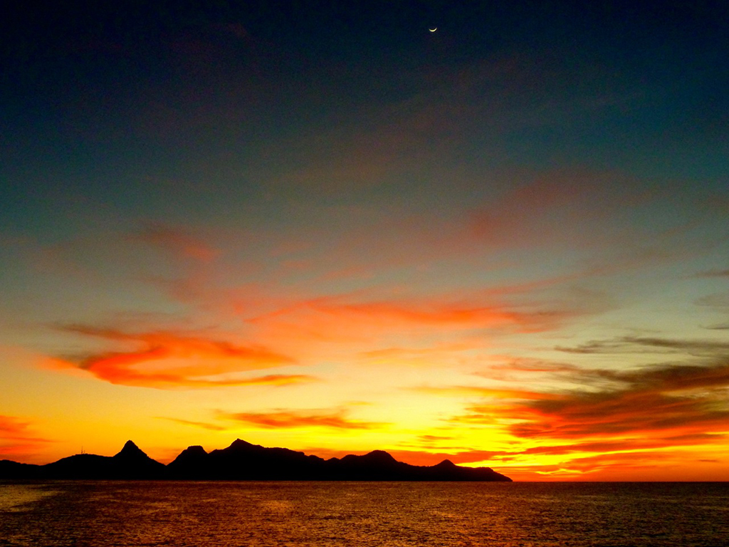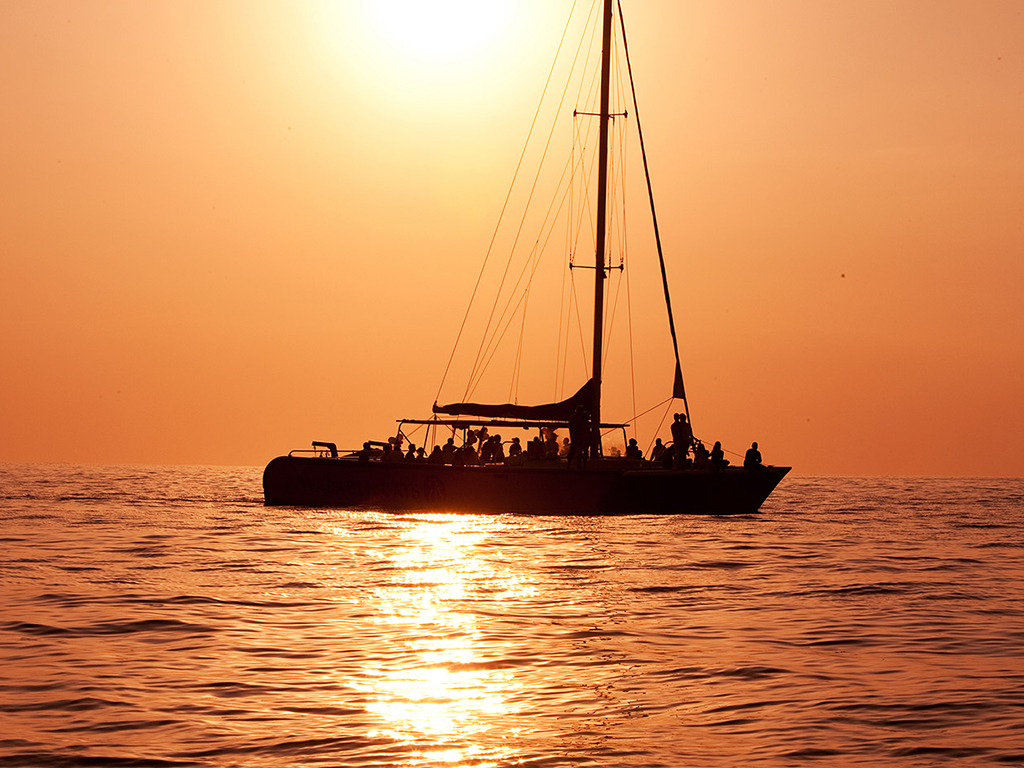 Capture the magic of a tropical sunset as you cruise out to sea aboard a beautiful catamaran.