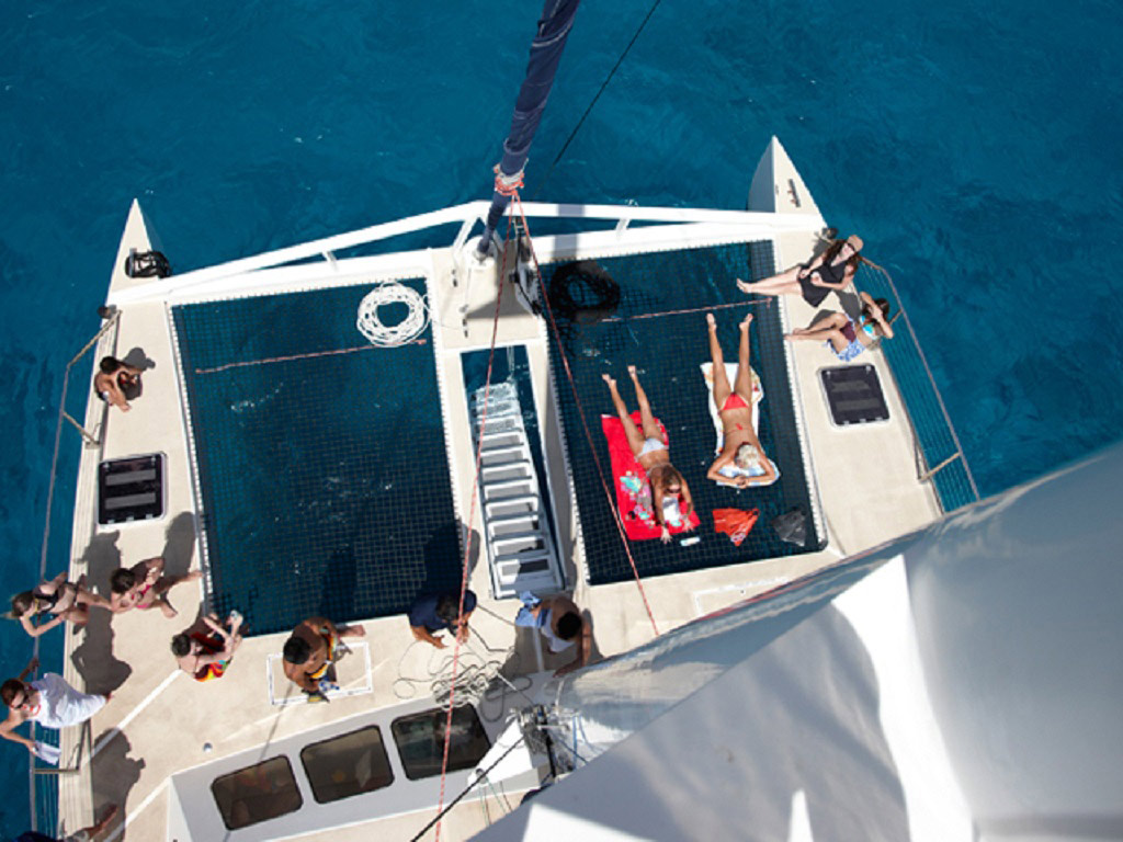 Amenities include a full bar with draft beer, a large fully-enclosed and covered cabin with table and bench seating, two full restrooms, freshwater shower, surround-sound system and multiple stairway entry points for snorkelers entering the water. Ample outdoor areas for sunning are also available before and after the vessel.