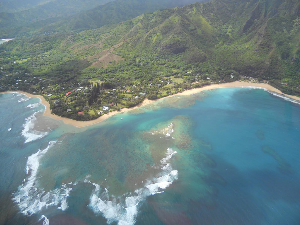 Next, we’ll make our way to the Waimea Canyon, described as “The Grand Canyon of the Pacific.” Stretching over 10 miles long and 3,600 feet deep, this valley is an incredible sight especially with the advantageous views from the sky. Fly over to Wailua Falls, at the south end of Wailua River. This cascading waterfall consists of two trickling streams that drop 80 feet below, you may recognize it from the opening credits of the TV show “Fantasy Land.”