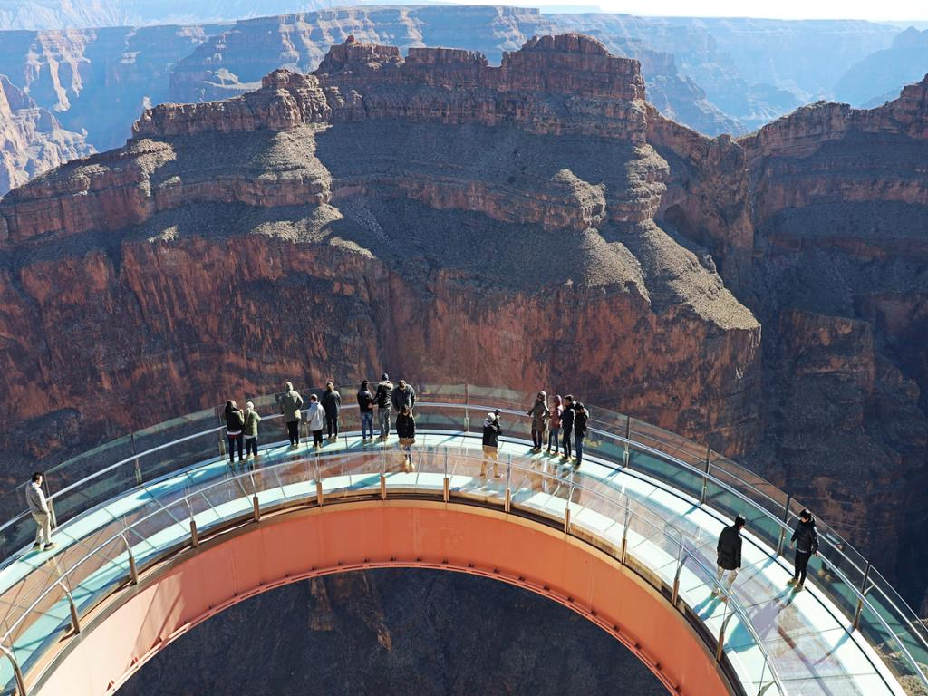 Land at the canyon rim and transfer by shuttle to the Grand Canyon Skywalk for a skip-the-line visit. From this horseshoe-shaped, glass-bottomed viewing platform you will be able to look down hundreds of metres below to the bottom of the canyon. It extends out more than 20 metres (70ft) from land, giving you the sensation of floating on air. (For safety reasons, cameras are not allowed on the Skywalk.)
